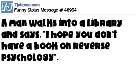 X A man walks into a library and says, "I hope you don't have a book on reverse psychology".