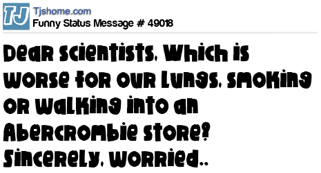 X is Dear scientists, Which is worse for our lungs, smoking or walking into an Abercrombie store? Sincerely, worried..