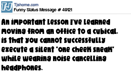 X an important lesson I've learned moving from an office to a cubical, is that you cannot successfully execute a silent "one cheek sneak" while wearing noise cancelling headphones.