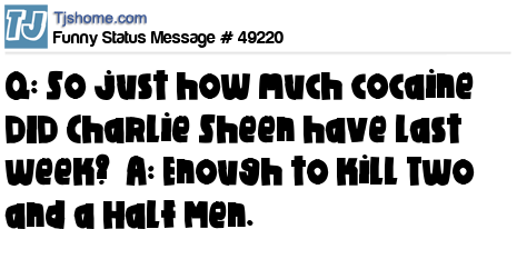 X says Q: So just how much cocaine DID Charlie Sheen have last week? A: Enough to kill Two and a Half Men.