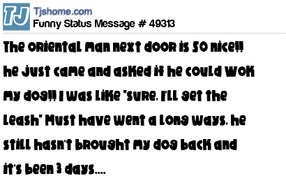 X is The oriental man next door is SO nice!! he just came and asked if he could Wok my dog!! I was like "sure, I'll get the leash" Must have went a long ways, he still hasn't brought my dog back and it's been 3 days....