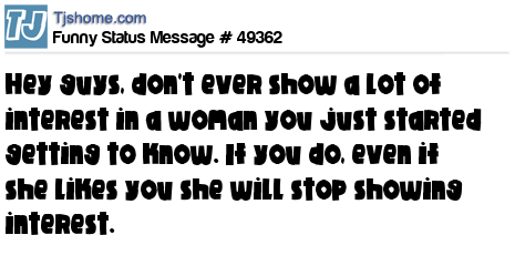 X Hey guys, don't ever show a lot of interest in a woman you just started getting to know. If you do, even if she likes you she will stop showing interest.