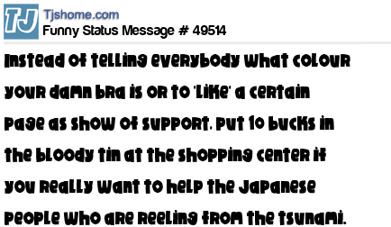 X is Instead of telling everybody what colour your damn bra is or to 'like' a certain page as show of support, put 10 bucks in the bloody tin at the shopping center if you really want to help the Japanese people who are reeling from the tsunami. Stop talking o