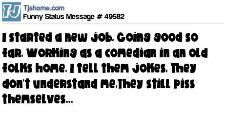 X I started a new job, Going good so far, Working as a comedian in an old folks home, I tell them jokes, They don't understand me,They still piss themselves...