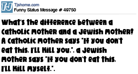 X What's the difference between a Catholic mother and a Jewish mother? A Catholic mother says "If you don't eat this, I'll kill you.", a Jewish mother says "If you don't eat this, I'll kill myself.".