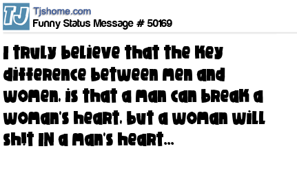 X I truly believe that the key difference between men and women, is that a man can break a woman's heart, but a woman will sh!t IN a man's heart...
