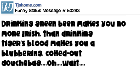 X Drinking green beer makes you no more Irish, than drinking tiger's blood makes you a blubbering, coked-out douchebag….oh….wait….