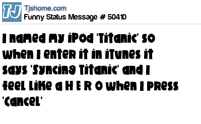 X I named my iPod 'Titanic' so when I enter it in iTunes it says 'Syncing Titanic' and I feel like a H E R O when I press 'Cancel'