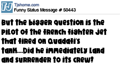 X  but the bigger question is the pilot of the french fighter jet that fired on Quadafi's tank....Did he immediately land and surrender to its crew?
