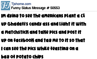 X is im dying to see the americans plant a C5 up Ghadafi's candy ass and light it with a matchstick and take pics and post it up on facebook and tag me to it so that I can see the pics while feasting on a bag of potato chips
