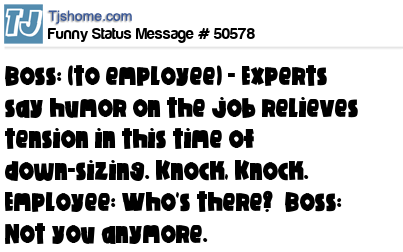 X is Boss: (to employee) - Experts say humor on the job relieves tension in this time of down-sizing. Knock, Knock. Employee: Who's there? Boss: Not you anymore.