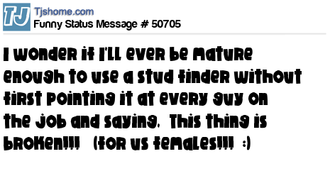 X  I wonder if I'll ever be mature enough to use a stud finder without first pointing it at every guy on the job and saying, “This thing is broken!!!”  (for us females!!!  :)