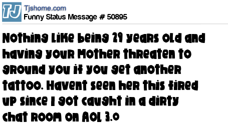 X says Nothing like being 29 years old and having your Mother threaten to ground you if you get another tattoo. Havent seen her this fired up since I got caught in a dirty chat room on AOL 3.0