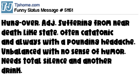 X is Hung-over, Adj. Suffering from near death like state, often catatonic and always with a pounding headache. Unbalanced with no sense of humor. Needs total silence and another drink.