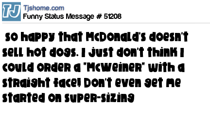 - # 107233 I am glad McDonalds doesn't sell hotdogs! I would hate to order a McWeiner!...And don't even get me started on Super Size!!!