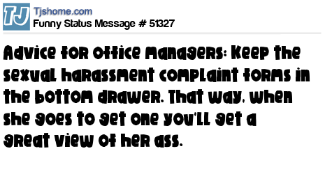 X Advice for office managers: Keep the sexual harassment complaint forms in the bottom drawer. That way, when she goes to get one you'll get a great view of her ass.