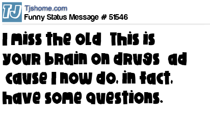 - # 36931 remember the old 80's drug commercials..The fryin pan and the egg? This is your brain....this is your brain on drugs...any questions? yeah can I have some bacon and toast with that ?