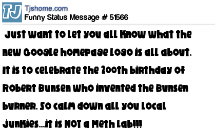 X is Just want to let you all know what the new Google homepage logo is all about. It is to celebrate the 200th birthday of Robert Bunsen who invented the Bunsen burner. So calm down all you local junkies...it is NOT a Meth lab!!!