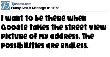 X I want to be there when Google takes the street view picture of my address. The possibilities are endless.