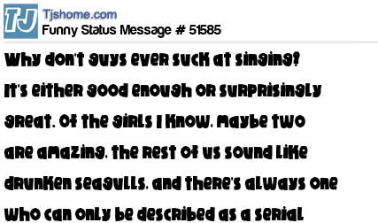 X Why don't guys ever suck at singing? It's either good enough or surprisingly great. Of the girls I know, maybe two are amazing, the rest of us sound like drunken seagulls, and there's always one who can only be described as a serial ear murderer.