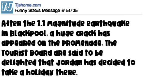 X  After the 2.2 magnitude earthquake in Blackpool, a huge crack has appeared on the promenade. The Tourist Board are said to be delighted that Jordan has decided to take a holiday there.