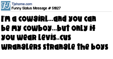 X says I'm a cowgirl...and you can be my cowboy...but only if you wear levis..cus wranglers strangle the boys