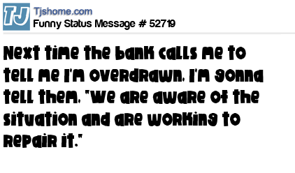 - # 204812 Next time the bank calls me to tell me I’m overdrawn, I’m gonna tell them “We are aware of the situation and are working to repair it”.