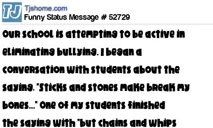 X is Our school is attempting to be active in eliminating bullying. I began a conversation with students about the saying, "Sticks and stones make break my bones..." One of my students finished the saying with "but chains and whips excite me!" Wow. Thank you,