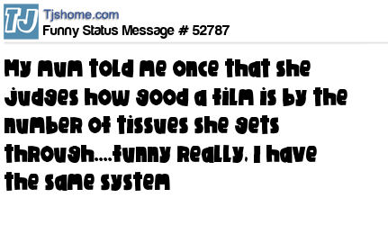 X says My mum told me once that she judges how good a film is by the number of tissues she gets through....funny really, I have the same system
