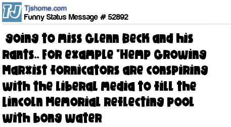 X going to miss Glenn Beck and his rants.. For example "Hemp Growing Marxist fornicators are conspiring with the liberal media to fill the Lincoln Memorial reflecting pool with bong water