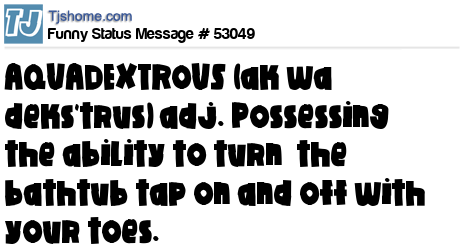 X says AQUADEXTROUS (ak wa deks'trus) adj. Possessing the ability to turn the bathtub tap on and off with your toes.