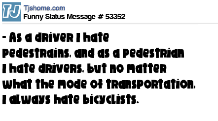 - # 188435 As a driver, I hate pedestrians and as a pedestrian, I hate drivers. But no matter what the mode of transportation, I always hate bicyclists.