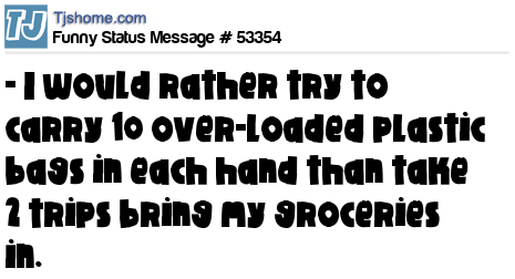 - # 83600 Lazy rule # 538: I would rather carry 10 overloaded plastic bags in each hand than taking 2 trips to bring my groceries in