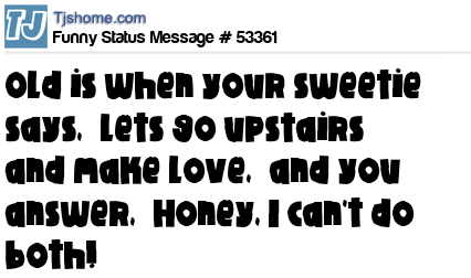 X is Old is when your sweetie says, “Lets go upstairs and make love,” and you answer, “Honey, I can't do both!”