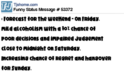 X : Forecast for the weekend - On Friday, mild alcoholism with a 70% chance of poor decisions and impaired judgement close to midnight on Saturday. Increasing chance of regret and hangover for Sunday.