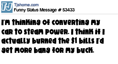 X I'm thinking of converting my car to steam power. I think if I actually burned the $1 bills I'd get more bang for my buck.