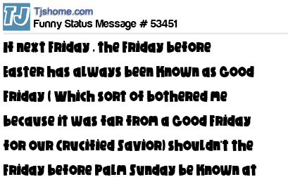 X says If next Friday , the Friday before Easter has always been known as Good Friday ( Which sort of bothered me because it was far from a Good Friday for our Crucified Savior) shouldn't the Friday before Palm Sunday be known at least as Mediocre Friday?