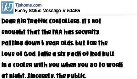 X Dear Air Traffic Contollers, It's not enought that the FAA has security patting down 6 year olds, but for the love of God, take a six pack of Red Bull in a cooler with you when you go to work at night. Sincerely, the public.