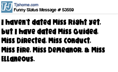 X I haven't dated Miss Right yet, but I have dated Miss Guided, Miss Directed, Miss Conduct, Miss Fire, Miss Demeanor, & Miss Ellaneous.