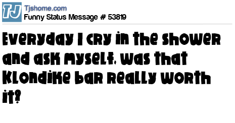 X  Everyday I cry in the shower and ask myself, was that Klondike bar really worth it?