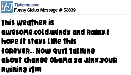 X This weather is awesome,cold,windy and rainy,I hope it stays like this forever... Now quit talking about change Obama ya jinx,your ruining it!!!