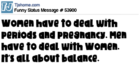 - # 100809 Women have to deal with periods and pregnancy, men have to deal with women. It's all about balance.