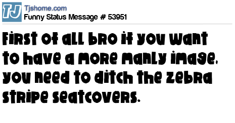 X First of all bro if you want to have a more manly image, you need to ditch the zebra stripe seatcovers.