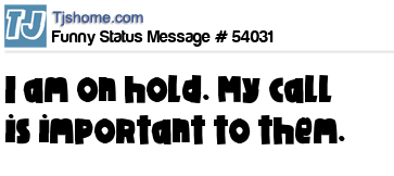 - # 190449 Every time I'm put on hold for longer then 10 minutes and a recorded message says "Your call is very important to us!" I cant help but wonder how long I'd have to wait if it wasn't very important?