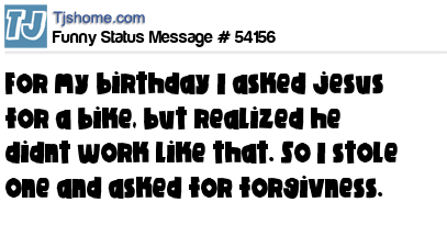 - # 16017 I asked God for a bike, but I know God doesn't work that way. So I stole a bike and asked for forgiveness.