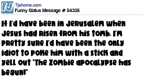 X If I'd have been in Jerusalem when Jesus had risen from his tomb, I'm pretty sure I'd have been the only idiot to poke him with a stick and yell out "The Zombie apocalypse has begun!"