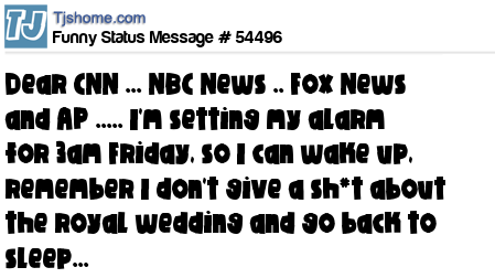- # 54401 I'm setting my alarm for 3am Friday, so I can wake up, remember I don't give a shit about the royal wedding and go back to sleep