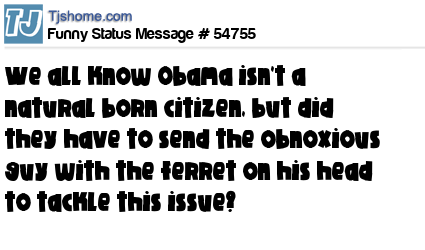 X says We all know Obama isn't a natural born citizen, but did they have to send the obnoxious guy with the ferret on his head to tackle this issue?