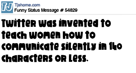 - # 56215 A big thankyou goes out to the inventors of texting on cell phones and social networks like Twitter! Teaching women to say what they really mean in 140 characters or less! Something men have been trying to teach them to do since the cave man.