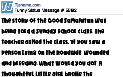X says the story of the Good Samaritan was being told a Sunday school class. The teacher asked the class, 'If you saw a person lying on the roadside, wounded and bleeding, what would you do?' A thoughtful little girl broke the silence, 'I think I'd throw up!'